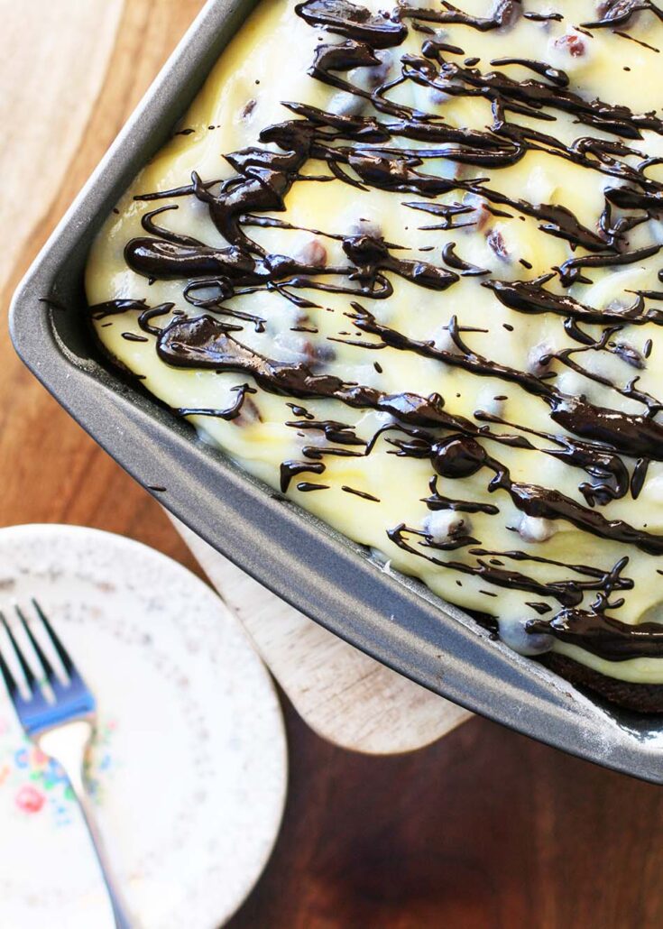 My mom and grandma used to top it with what they called Egyptian frosting, a sour cream-based sauce with raisins, topped with unsweetened chocolate. (Scroll down to the bottom of this post for the Egyptian frosting recipe my family makes.)